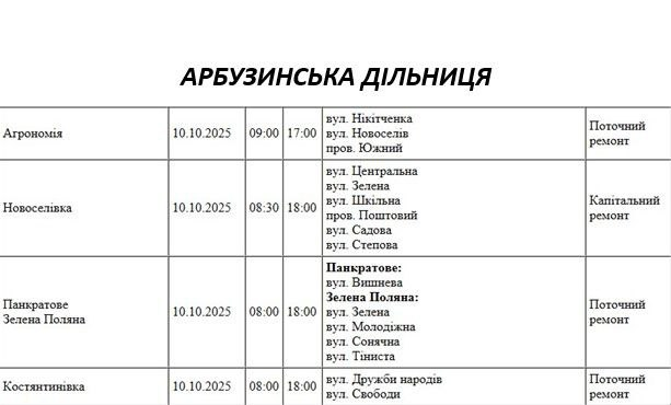 Графік відключення світла по адресах 10 жовтня, Арбузинська дільниця. АТ «Миколаївобленерго»