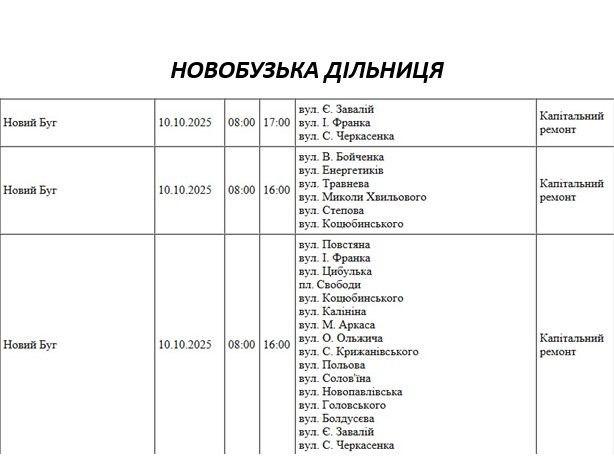 Графік відключення світла по адресах 10 жовтня, Новобузька дільниця. АТ «Миколаївобленерго»