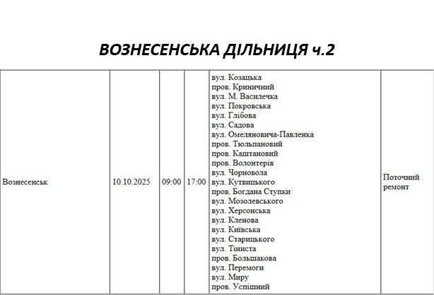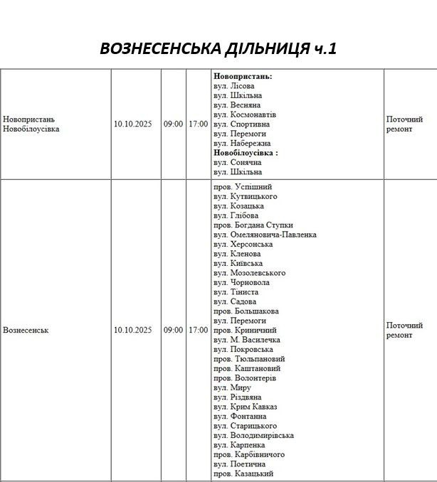 Графік відключення світла по адресах 10 жовтня, Вознесенська дільниця. АТ «Миколаївобленерго»