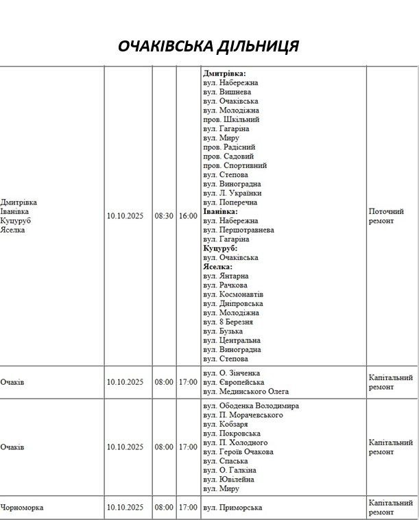 Графік відключення світла по адресах 10 жовтня, Очаківська дільниця. АТ «Миколаївобленерго»