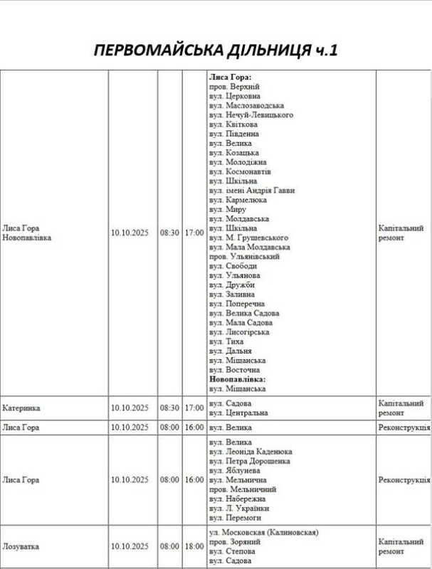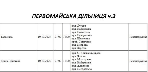 Графік відключення світла по адресах 10 жовтня, Первомайська дільниця. АТ «Миколаївобленерго»