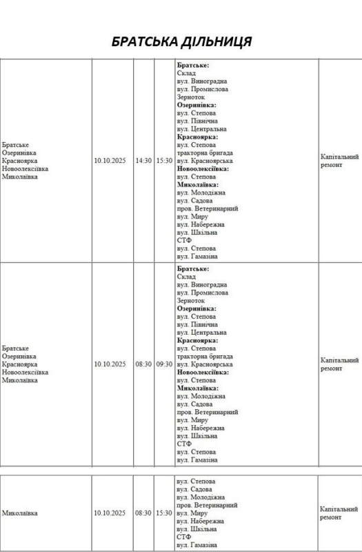 Графік відключення світла по адресах 10 жовтня, Братська дільниця. АТ «Миколаївобленерго»