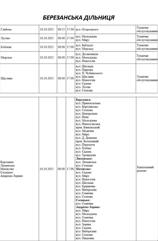 Графік відключення світла по адресах 10 жовтня, Березанська дільниця. АТ «Миколаївобленерго»