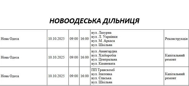 Графік відключення світла по адресах 10 жовтня, Новоодеська дільниця. АТ «Миколаївобленерго»
