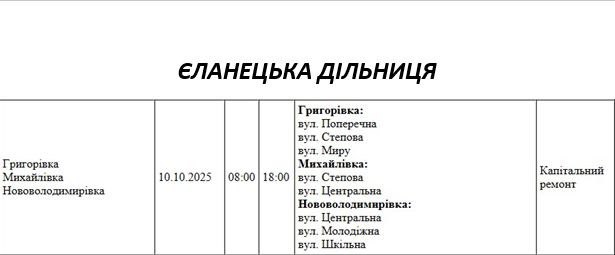 Графік відключення світла по адресах 10 жовтня, Єланецька дільниця. АТ «Миколаївобленерго»