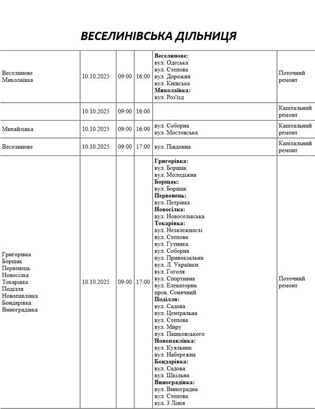 Графік відключення світла по адресах 10 жовтня, Веселинівська дільниця. АТ «Миколаївобленерго»