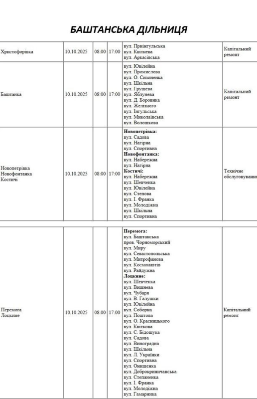 Графік відключення світла по адресах 10 жовтня, Баштанська дільниця. АТ «Миколаївобленерго»