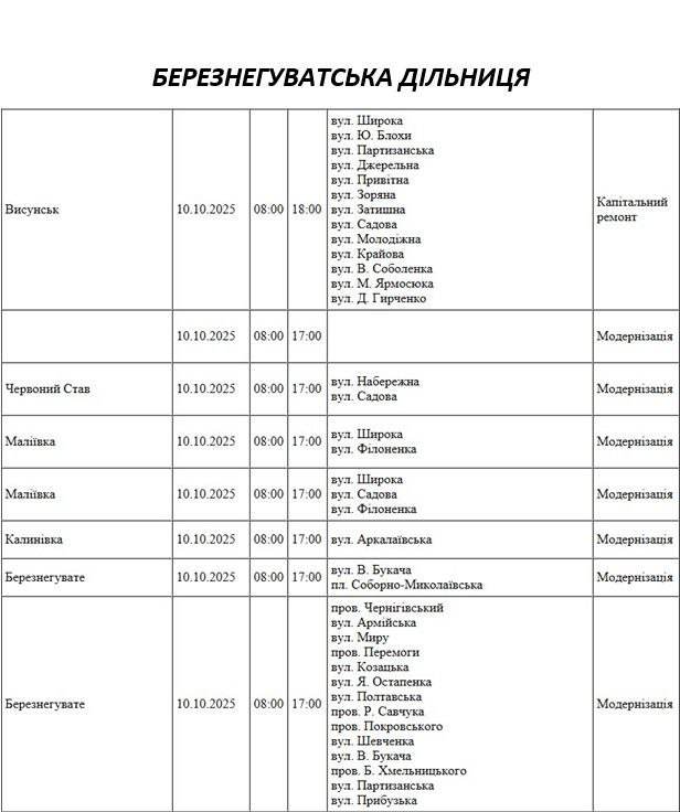 Графік відключення світла по адресах 10 жовтня, Березнегуватська дільниця. АТ «Миколаївобленерго»