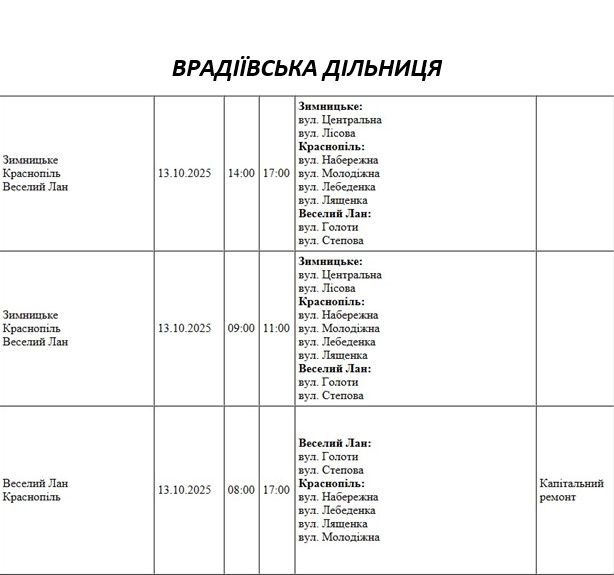 Графік відключення світла по адресах на 13 жовтня, Врадіївська дільниця АТ «Миколаївобленерго»