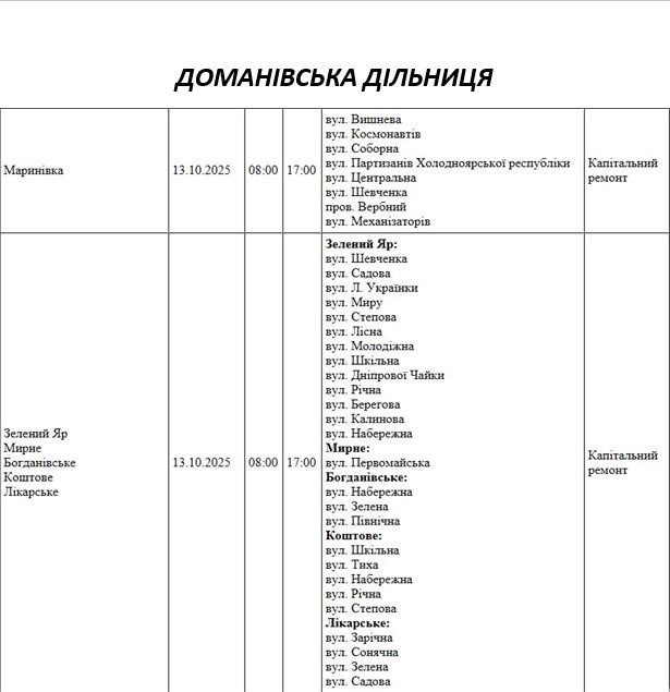 Графік відключення світла по адресах на 13 жовтня, Доманівська дільниця АТ «Миколаївобленерго»