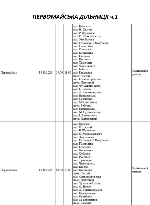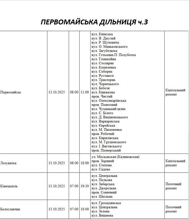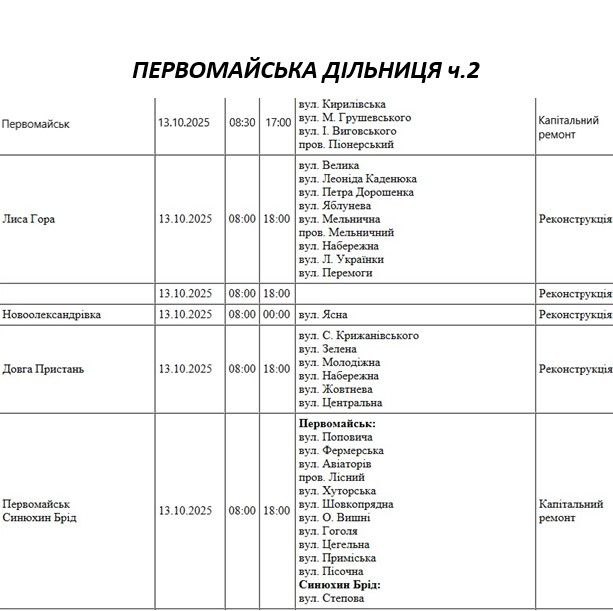 Графік відключення світла по адресах на 13 жовтня, Первомайська дільниця АТ «Миколаївобленерго»
