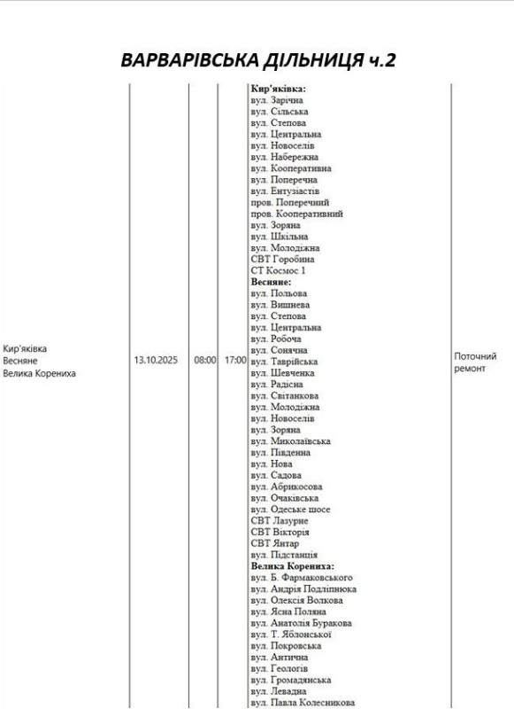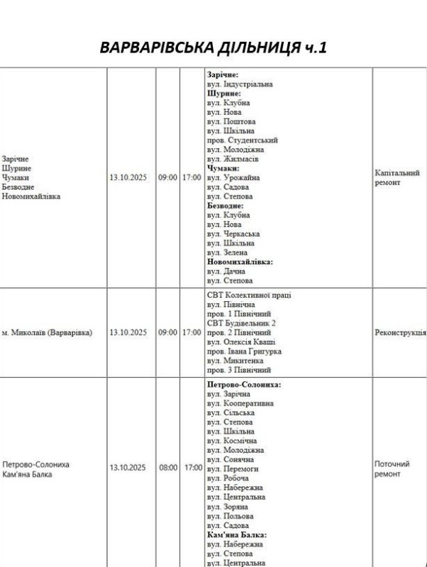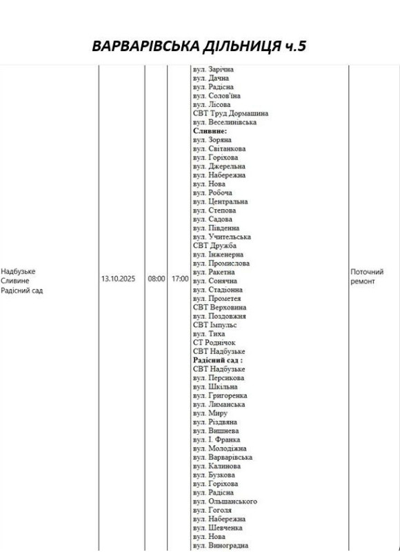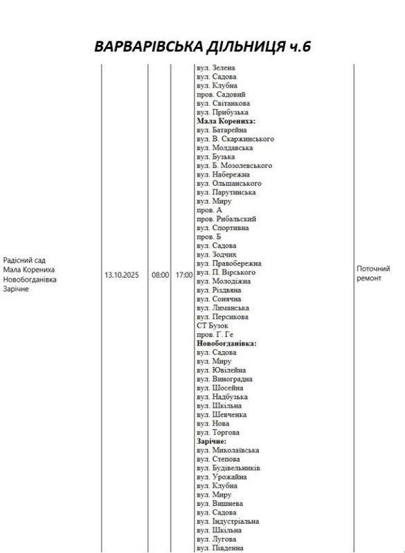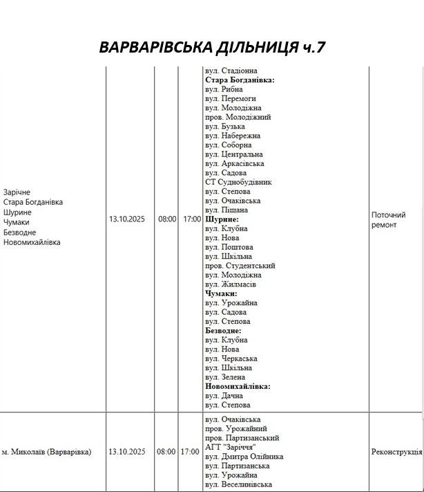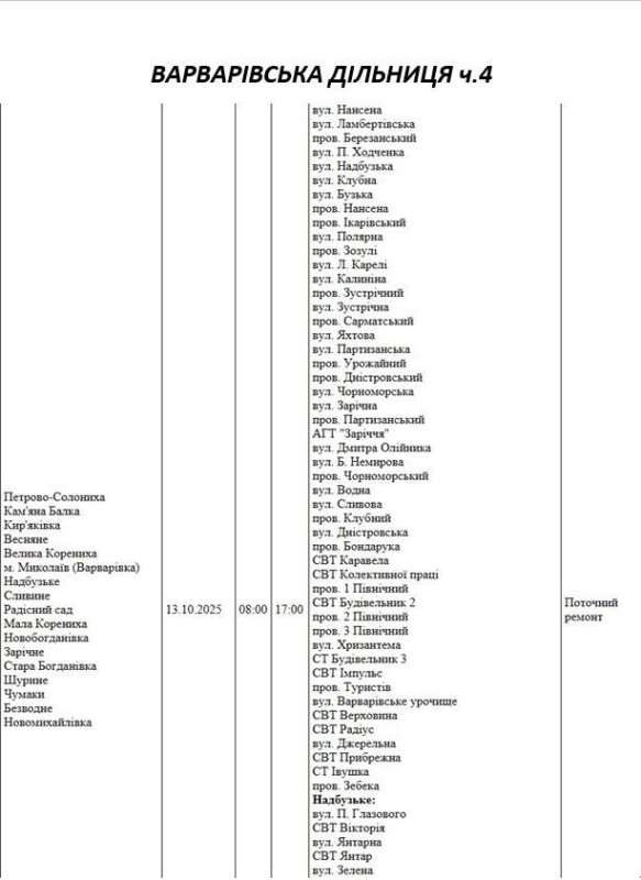 Графік відключення світла по адресах на 13 жовтня, Варварівська дільниця АТ «Миколаївобленерго»