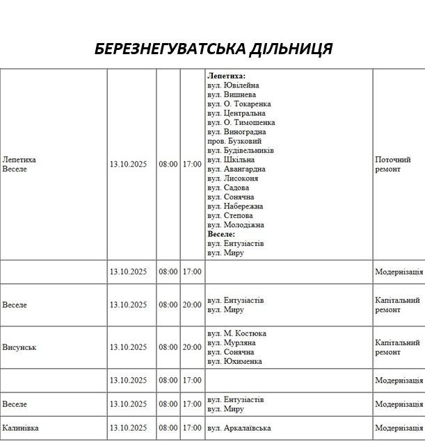 Графік відключення світла по адресах на 13 жовтня, Березенгуватська дільниця АТ «Миколаївобленерго»