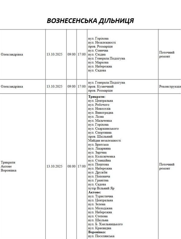 Графік відключення світла по адресах на 13 жовтня, Вознесенська дільниця АТ «Миколаївобленерго»