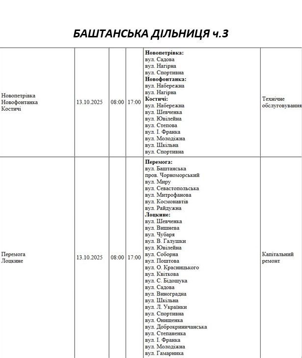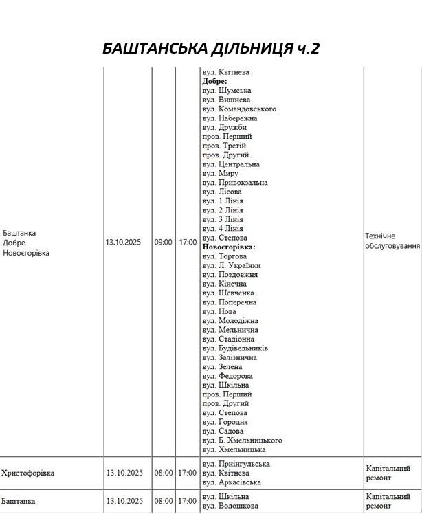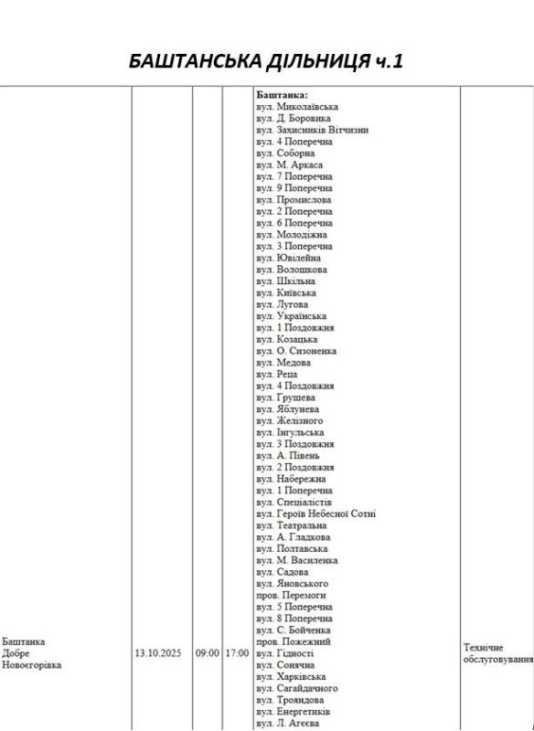 Графік відключення світла по адресах на 13 жовтня, Баштанська дільниця АТ «Миколаївобленерго»