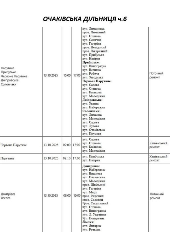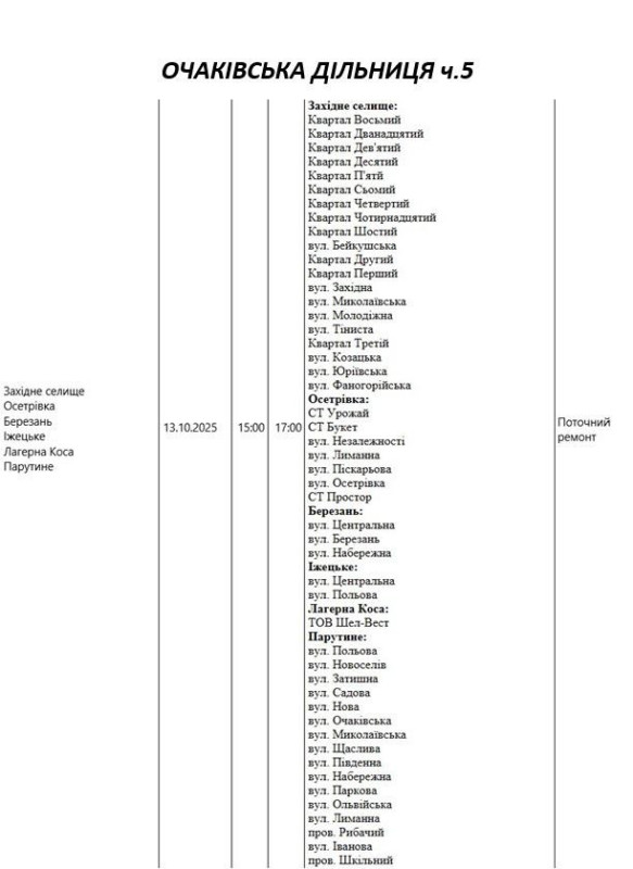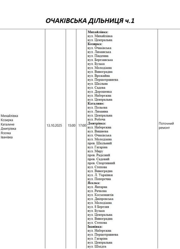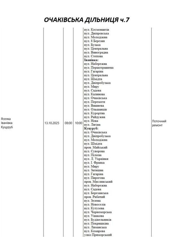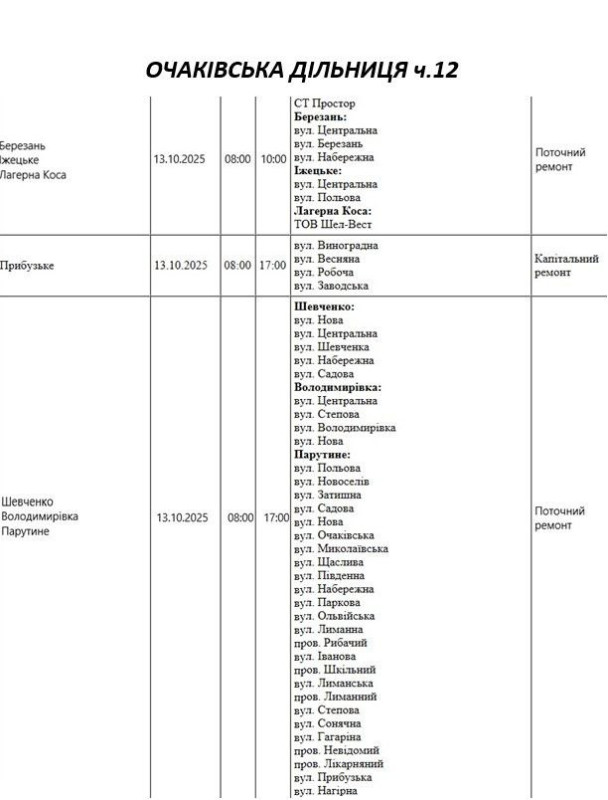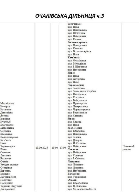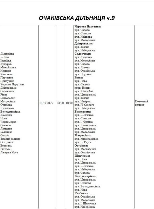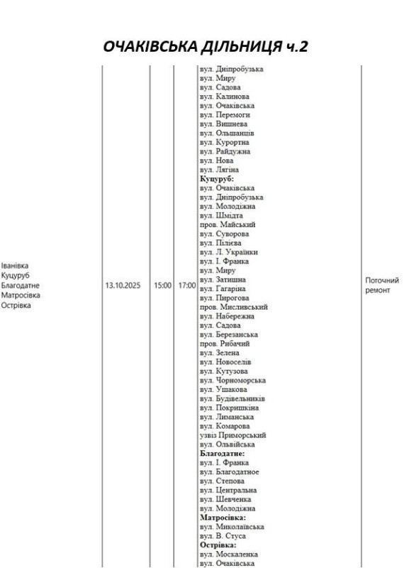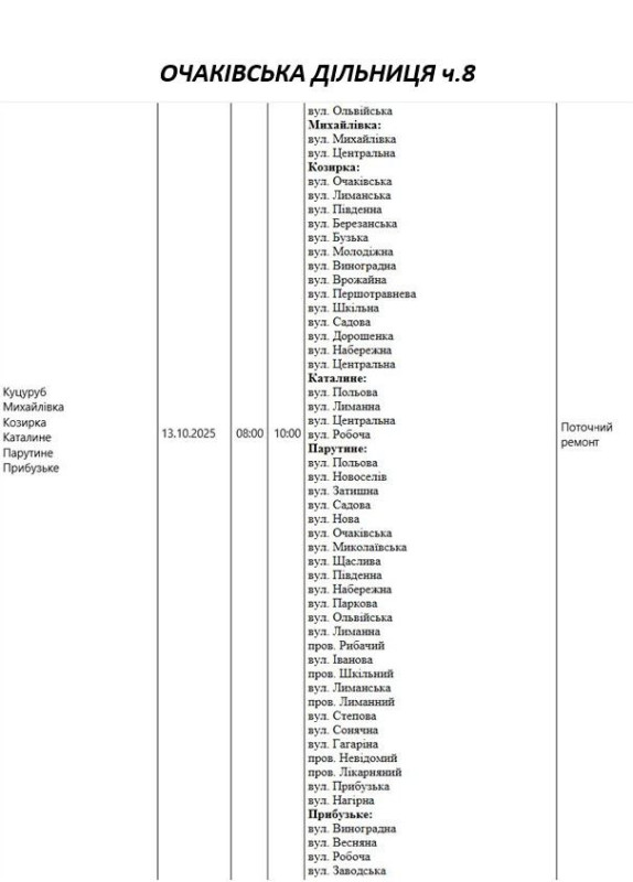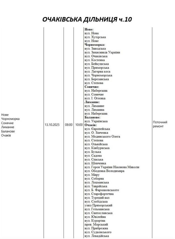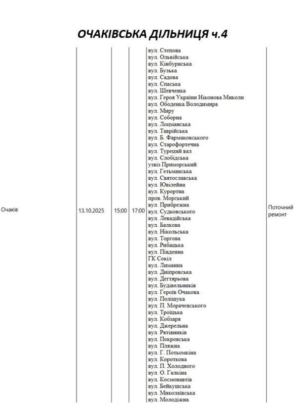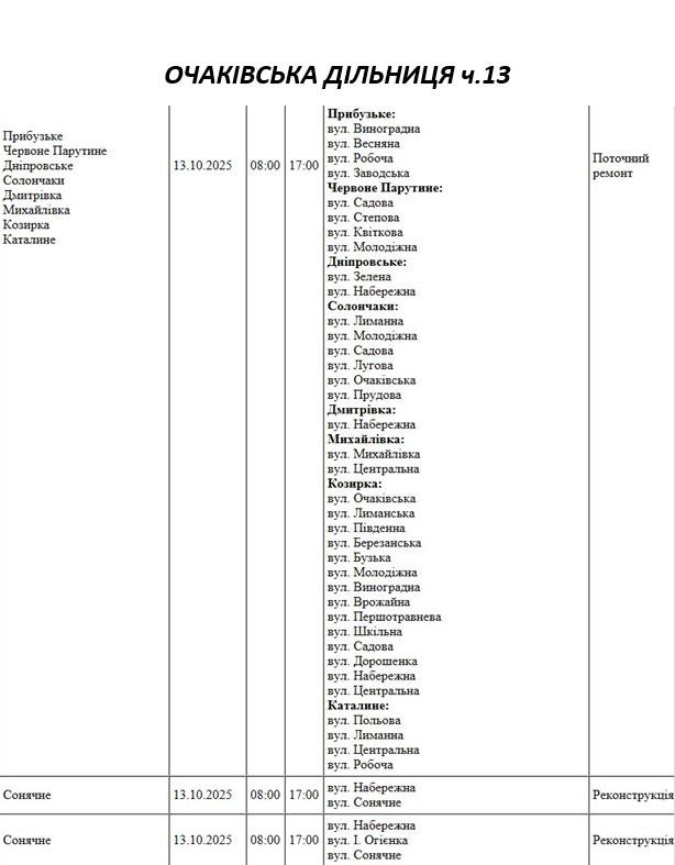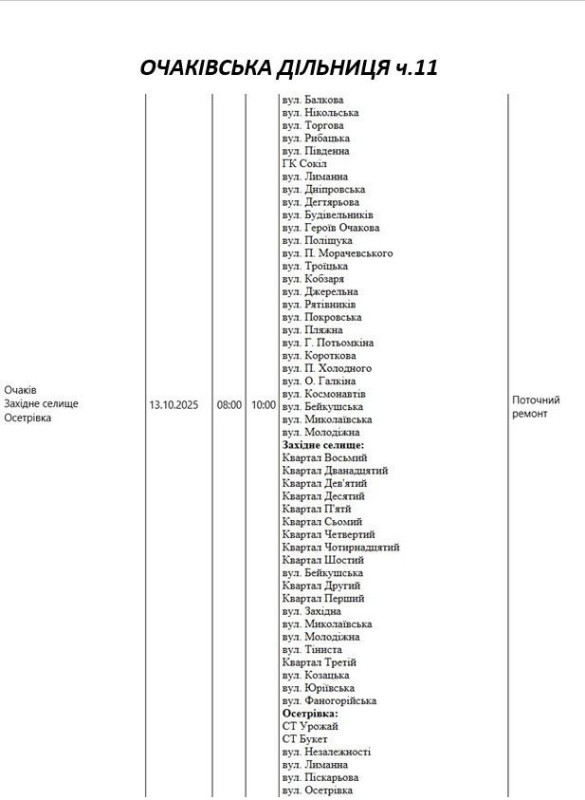 Графік відключення світла по адресах на 13 жовтня, Очаківська дільниця АТ «Миколаївобленерго»