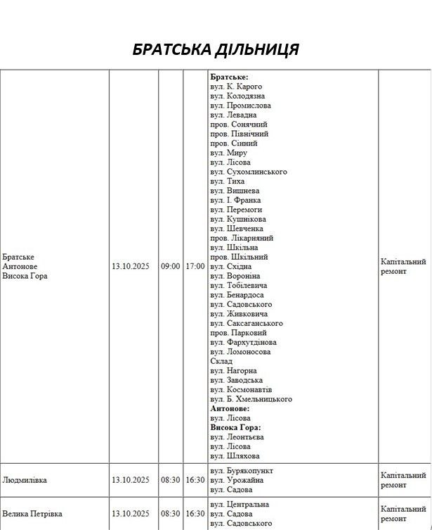 Графік відключення світла по адресах на 13 жовтня, Братська дільниця АТ «Миколаївобленерго»