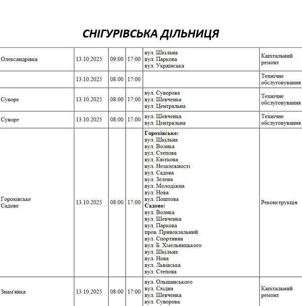 Графік відключення світла по адресах на 13 жовтня, Снігурівська дільниця АТ «Миколаївобленерго»