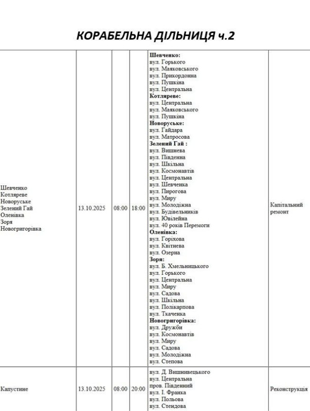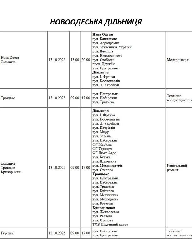 Графік відключення світла по адресах на 13 жовтня, Новоодеська дільниця АТ «Миколаївобленерго»