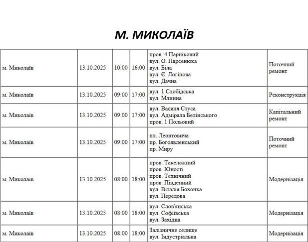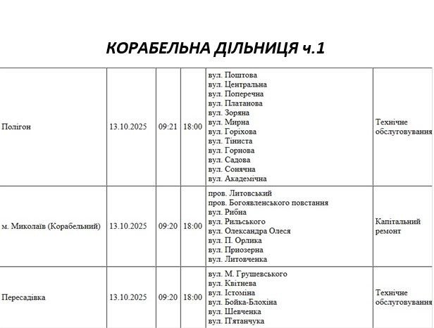 Графік відключення світла по адресах на 13 жовтня, Миколаївська дільниця АТ «Миколаївобленерго»