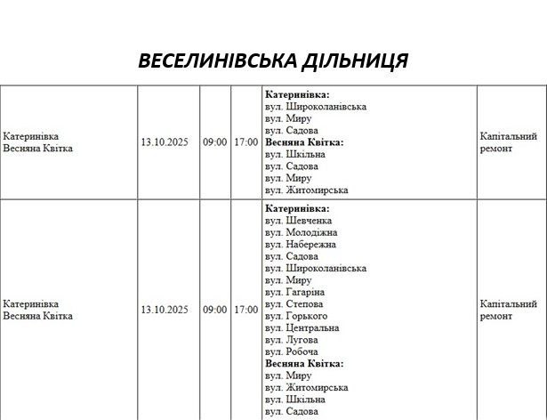 Графік відключення світла по адресах на 13 жовтня, Веселинівська дільниця АТ «Миколаївобленерго»