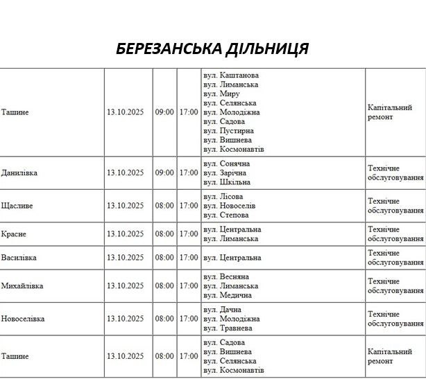 Графік відключення світла по адресах на 13 жовтня, Березанська дільниця АТ «Миколаївобленерго»
