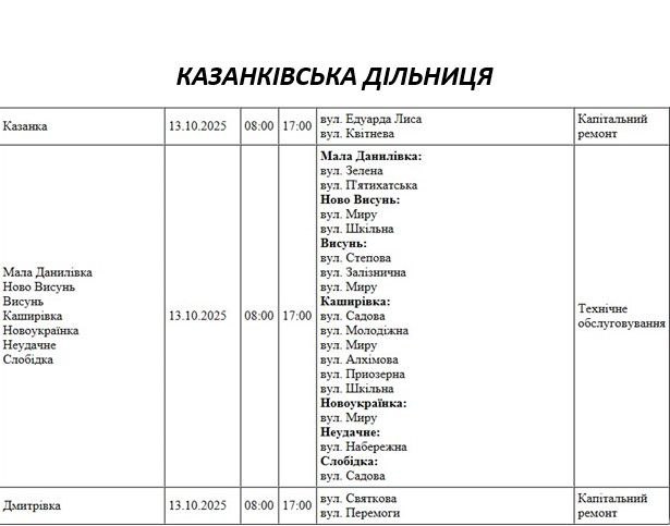 Графік відключення світла по адресах на 13 жовтня, Казанківська дільниця АТ «Миколаївобленерго»