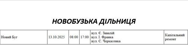 Графік відключення світла по адресах на 13 жовтня, Новобузька дільниця АТ «Миколаївобленерго»
