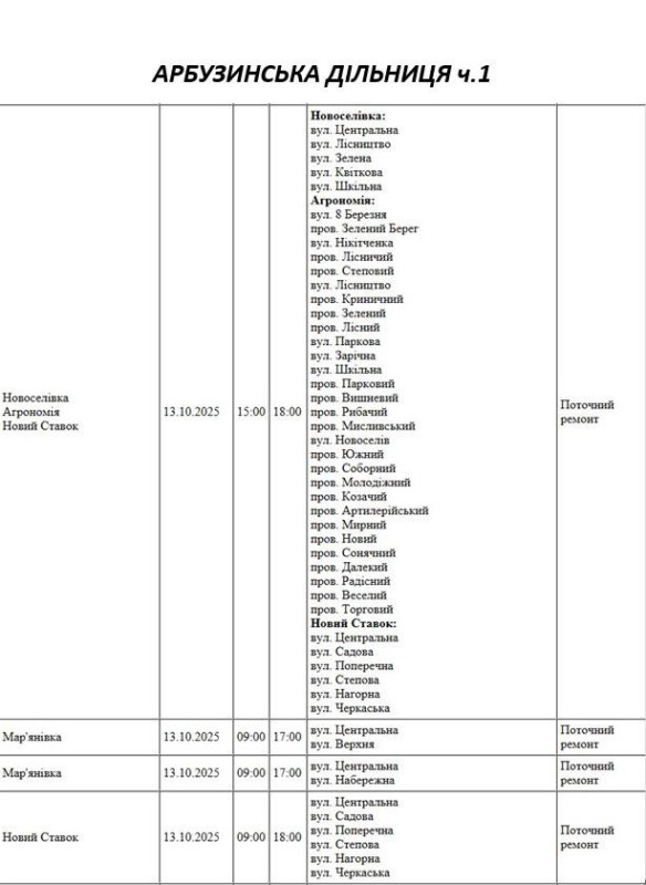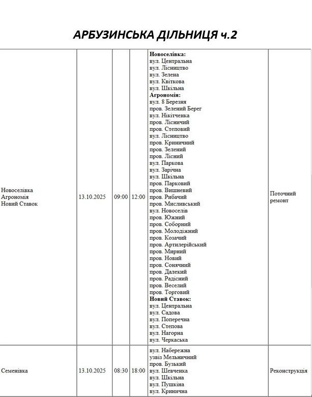 Графік відключення світла по адресах на 13 жовтня, Арбузинська дільниця АТ «Миколаївобленерго»