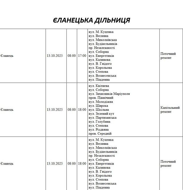 Графік відключення світла по адресах на 13 жовтня, Єланецька дільниця АТ «Миколаївобленерго»