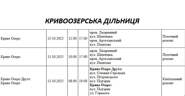 Графік відключення світла по адресах на 13 жовтня, Кривоозерська дільниця АТ «Миколаївобленерго»