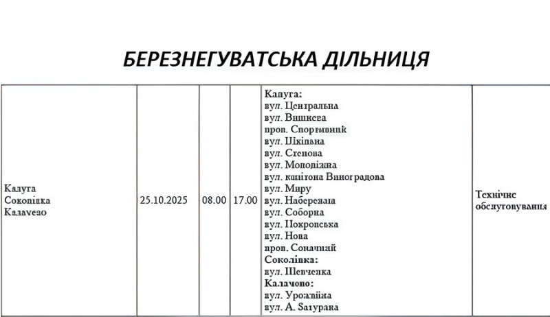 Графік відключення світла по адресах на 25 жовтня, Березенгуватська дільниця. АТ «Миколаївобленерго»