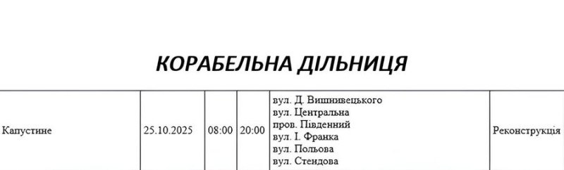 Графік відключення світла по адресах на 25 жовтня, Корабельна дільниця. АТ «Миколаївобленерго»