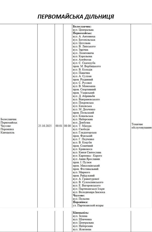 Графік відключення світла по адресах на 25 жовтня, Первомайська дільниця. АТ «Миколаївобленерго»