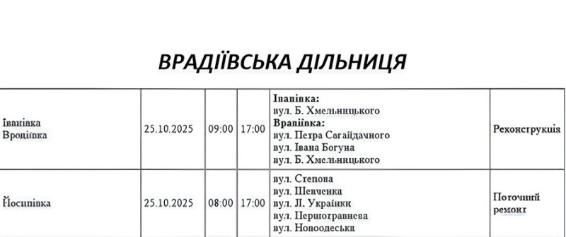 Графік відключення світла по адресах на 25 жовтня, Врадіївська дільниця. АТ «Миколаївобленерго»