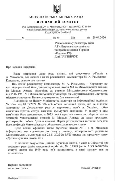 "Відповідно до статуту закладу, затвердженого рішенням Миколаївської міської ради від 22.11.2022 №15/25, заклад має юридичну назву “Дитяча музична школа №1”. У Свідоцтві про державну реєстрацію юридичної особи від 20.10.1999 року, статуті школи від 1999 року ім’я композитора в назві закладу теж не зазначалось", — повідомили у виконкомі.