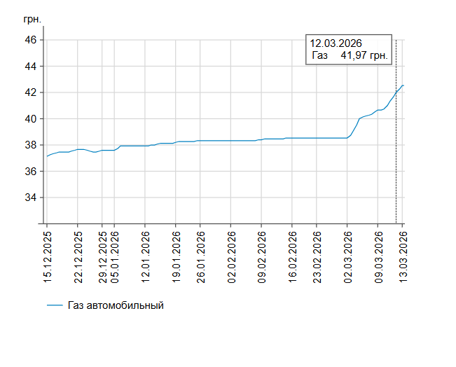 Зокрема, 13 березня зафіксовано такі середні ціни на пальне: бензин марки А-95 (преміум) — 72,71 грн/л; бензин марки А-95 — 69,14 грн/л; бензин марки А-92 — 66,2 грн/л (здорожчав на 1 коп.), дизпальне — 74,91 грн/л (здорожчало на 54 коп). Середня ціна автогазу становить 42,5 грн/л, що на 53 коп. дорожче порівняно з попереднім днем.