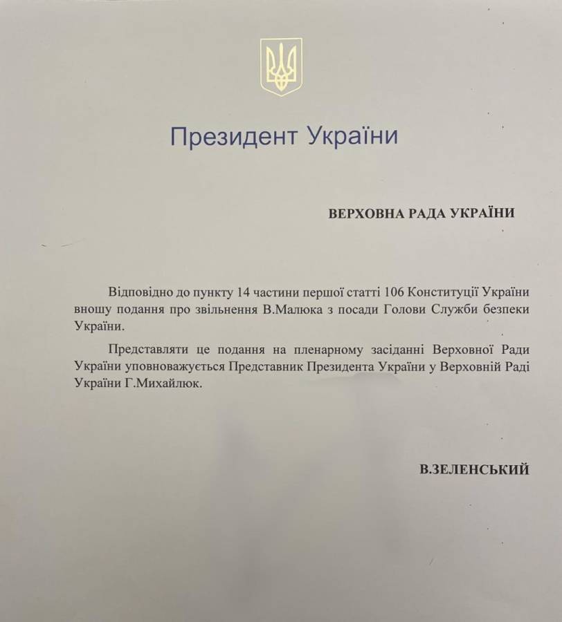 До Верховної Ради надійшло подання Президента України Володимира Зеленського про звільнення Василя Малюка з посади Голови Служби безпеки України.