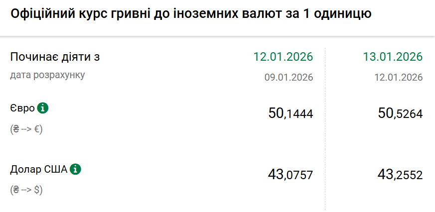 Офіційні курси валют на вівторок, 13 січня, становитимуть: