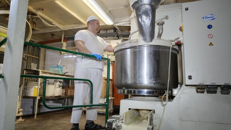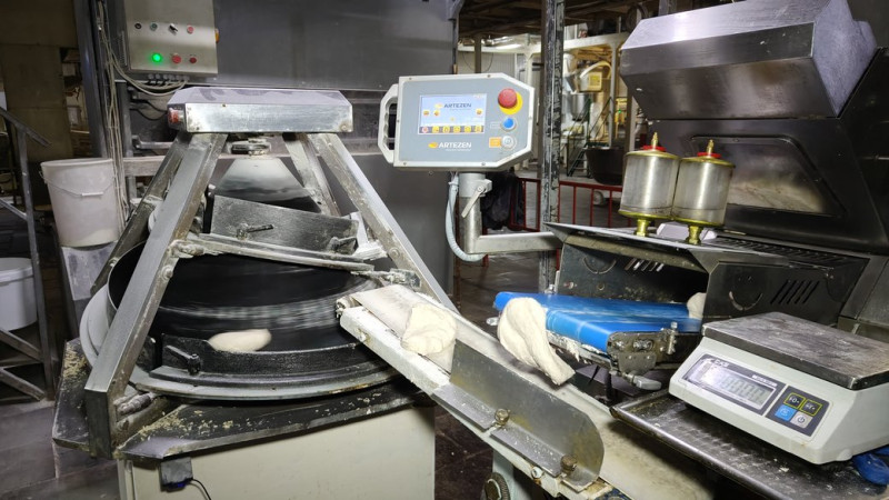 "Наразі ми з вами знаходимось на нашій технологічній лінії, де відбувається операція автоматичного поділу тістових заготовок на шматки, далі відбувається процес округлення. Після вистоювання та набуття форми — у даному разі батон та хлібини, прямують до печі", — каже Чиканчи.