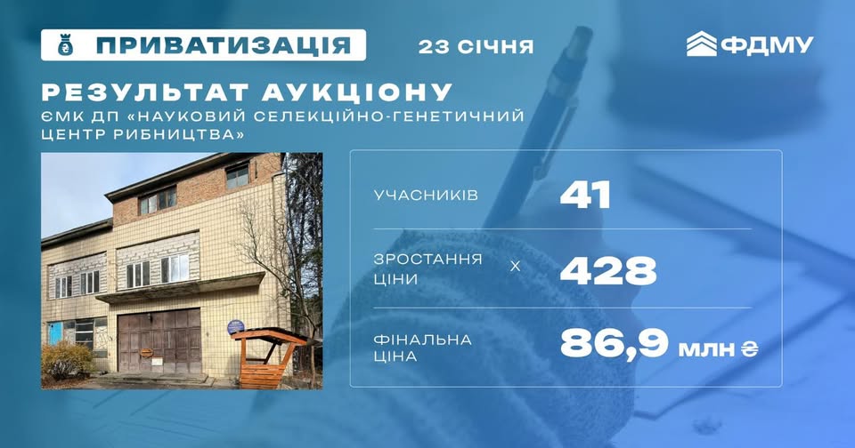 Фонд державного майна реалізував на приватизаційному аукціоні держпідприємство «Науковий селекційно-генетичний центр рибництва» за 86,9 млн грн; переможець має ще сплатити 17,4 млн грн податку на додану вартість.