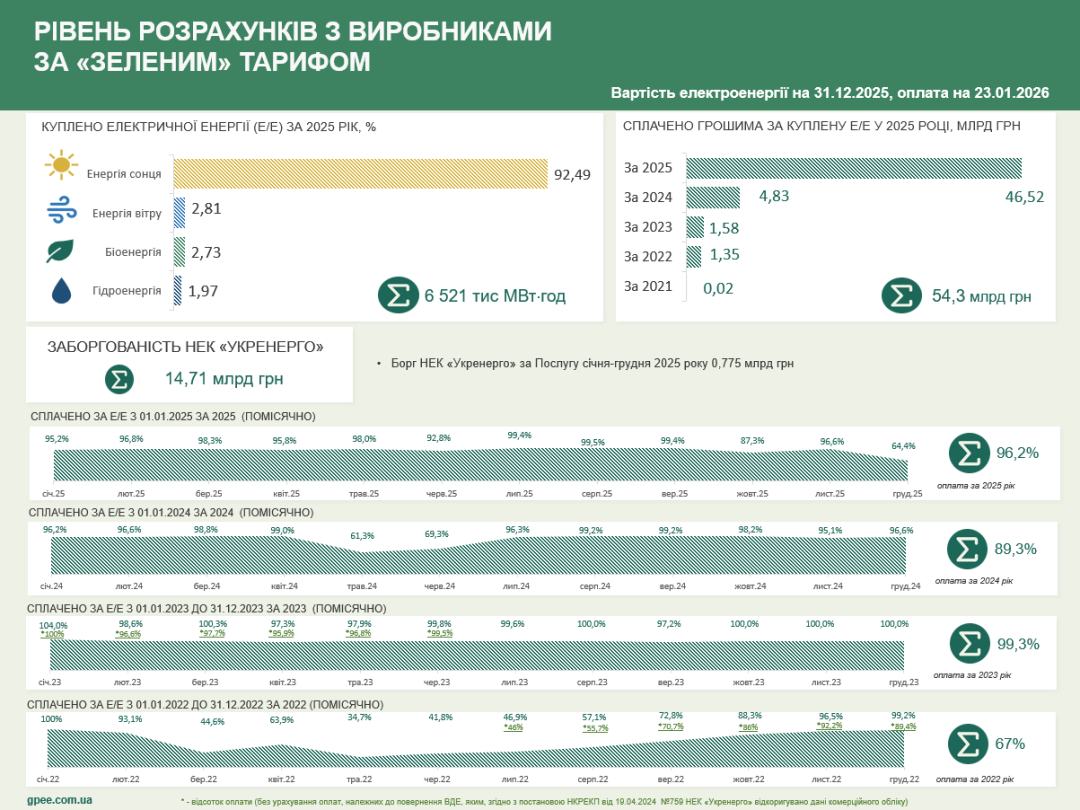 Рівень розрахунків "Гарантованого покупця" з виробниками "зеленої" енергії становить: за 2025 рік — 96,2%, за 2024 рік — 89,3%, за 2023 рік — 99,3%, за 2022 рік — 67%.