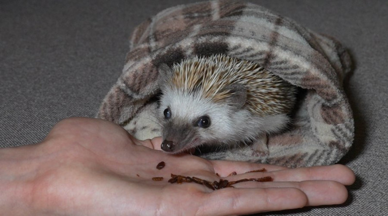 "Їжачок — це хижак, і він полюбляє м'ясо. Але м'ясо не все: більш дієтичне, простіше, щоб йому було краще його перетравлювати, бо він декоративний. М'ясо курки варене, сердечка, можна трошечки печінки, обов'язково варені яйця, якщо вони курині, і перепелині маленькі яйця, він любить сирі. Тобто нескладне в нього меню, а також я знаю, що він полюбляє дитяче пюре, але банан або яблучко", — каже Ольга.