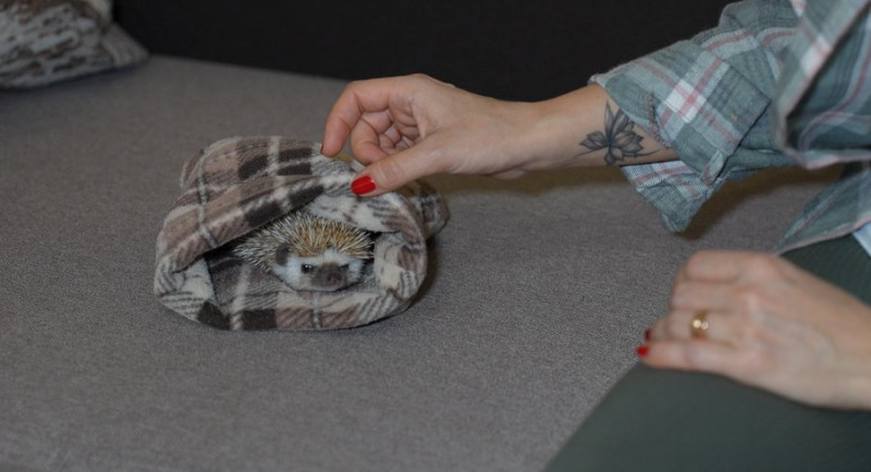 "Ми дуже любимо тваринок — у нас жили різні: і тритони, і рожеві жабки, і коти. Зараз у нас кіт бігає тут. Ельдар ще змалку хотів їжачка. Колись була така ситуація, що він в будинок нам приніс їжачка, і він жив у мене під ліжком, я й не знала. І тут, під час війни, він хотів щось таке цікаве. Ми приглядали, і у нас, чесно кажучи, невеликий вибір таких декоративних їжачків", — каже власниця їжачка Ольга Насирова.