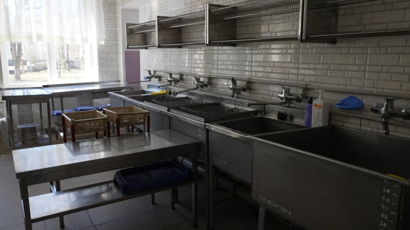 Мийна зона на кухні: кілька великих раковин, столи та сушарки для посуду. Суспільне Миколаїв/Богдана Будулуца