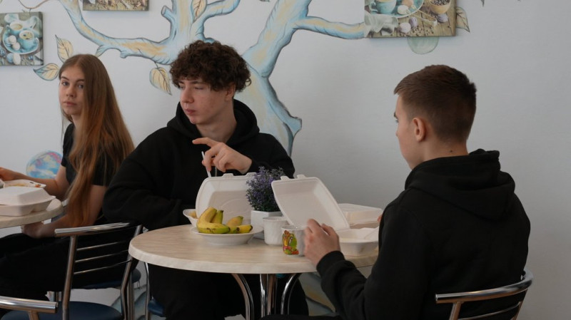 У денному шкільному меню — булгур, курячі котлети, тушкована капуста, кефір та банани. Однокласник Софії, Ілля, говорить, що зараз до школи привозять теплу їжу, хоча на початку були проблеми.