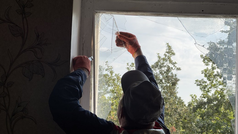 Працівник комунальної служби збирає скло з пошкодженого внаслідок атаки РФ вікна. Суспільне Миколаїв/Юлія Голокоз