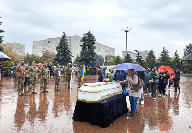 Люди кладуть квіти на труну загиблого військового Дениса Тяжельнікова, 7 жовтня 2025 року. Міськвиконком Південноукраїнська
