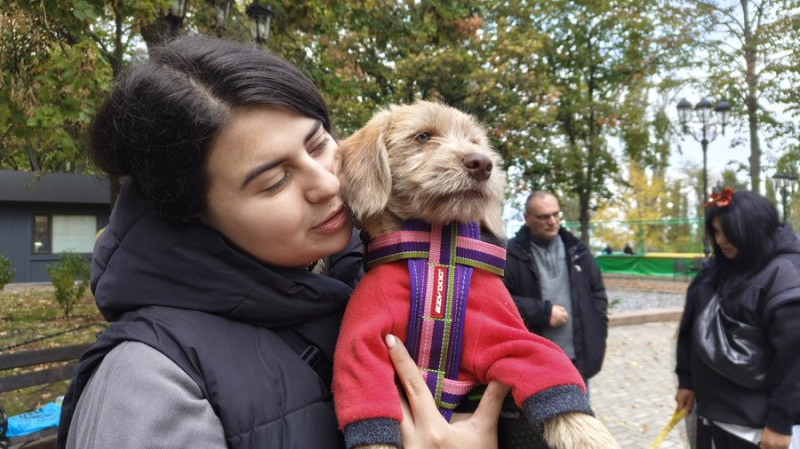 Миколаївчанка Аліна із собакою під час виставки-прилаштування тварин, Миколаїв, 11 жовтня 2025 року. Суспільне Миколаїв/Федір Бондар