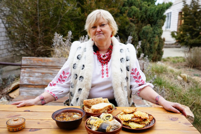 Господиня Наталя Ємельянцева сидить за столом поруч із приготовленими стравами. Суспільне Миколаїв/Олександр Гордієнко